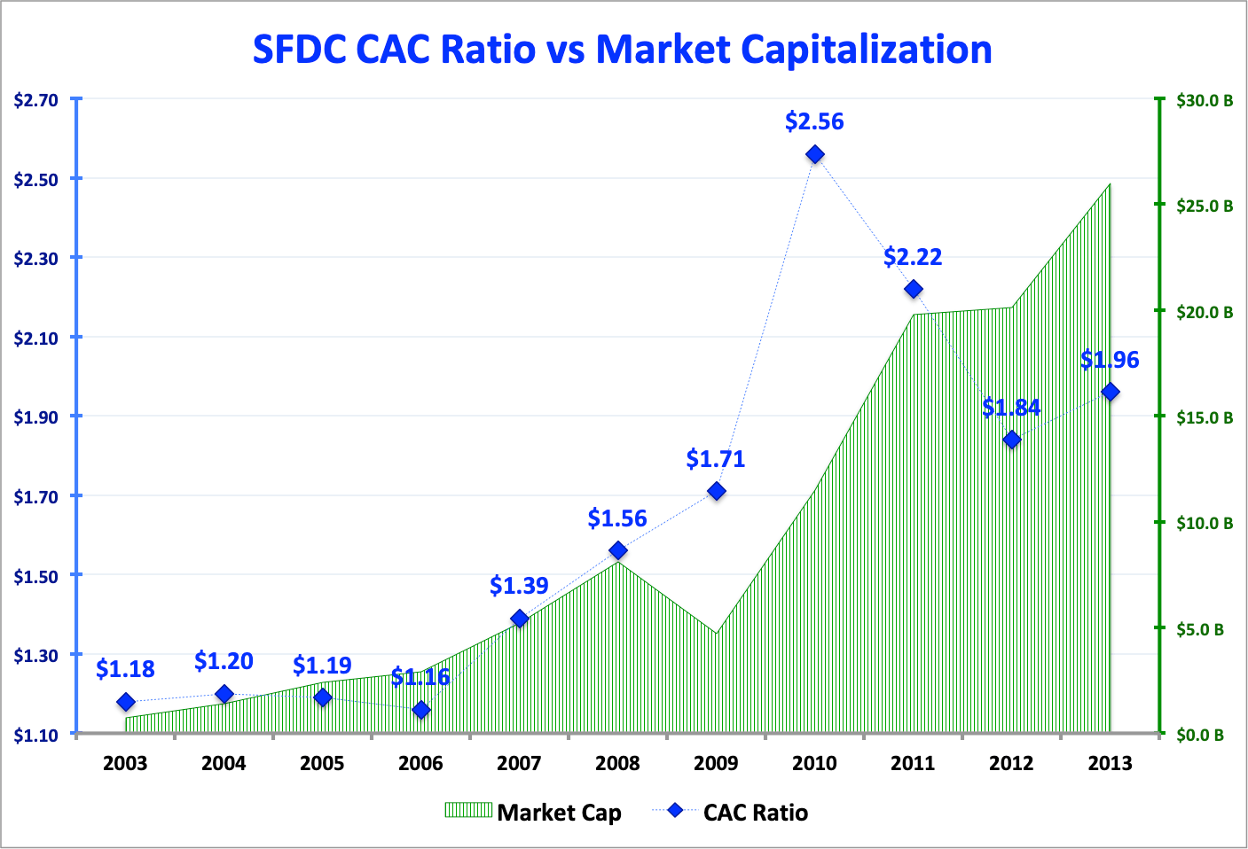 To understand where to initially focus, take a look at the figure to the right. It shows Salesforce’s Customer Acquisition Cost (CAC) ratio relative to its market capitalization. At first glance, it makes absolutely no sense, they were burning through a ton of cash to acquire customers and their stock price was growing exponentially… so what gives? The answer is tied to customer success. In 2007 when customer success at Salesforce was about 2 years old, it had begun to show solid results relative to churn. This enabled Salesforce to get extremely aggressive in the amount they spent to acquire new customers. In 2007 the spent $1.39 for $1.00 of new revenue, and that ratio continued to go up. Through the financial crisis of 2008 Marc never wavered, spending approximately $1.71 for $1.00 of new customer revenue, and as the economy began to show some life, this number soared to over $2.50.